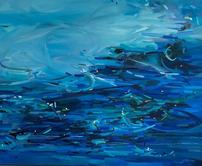 This painting evokes the movement of the ocean through expressive, visible brushstrokes. Layers of paint surge and shift, capturing the rhythm and energy of water in motion.